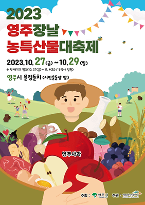 소개 : 영주 사과축제가 새로운 모습으로 돌아온다. 전국 최고의 일조량과 소백산의 깊은 맛을 품은 영주 농특산물, 맛의 끝장, 그 깊은 세계로 모두를 초대합니다. 시원한 가을바람과 소백산의 정기를 머금은 영주 농특산물을 한 아름 안아 갈 수 있는 특별한 기회가 될 것입니다. 영주장날 농특산물 축제에서 건강한 농특산물을 맛보며 스트레스를 한방에 해소할만한 맛의 극치를 느껴볼 수 있습니다.